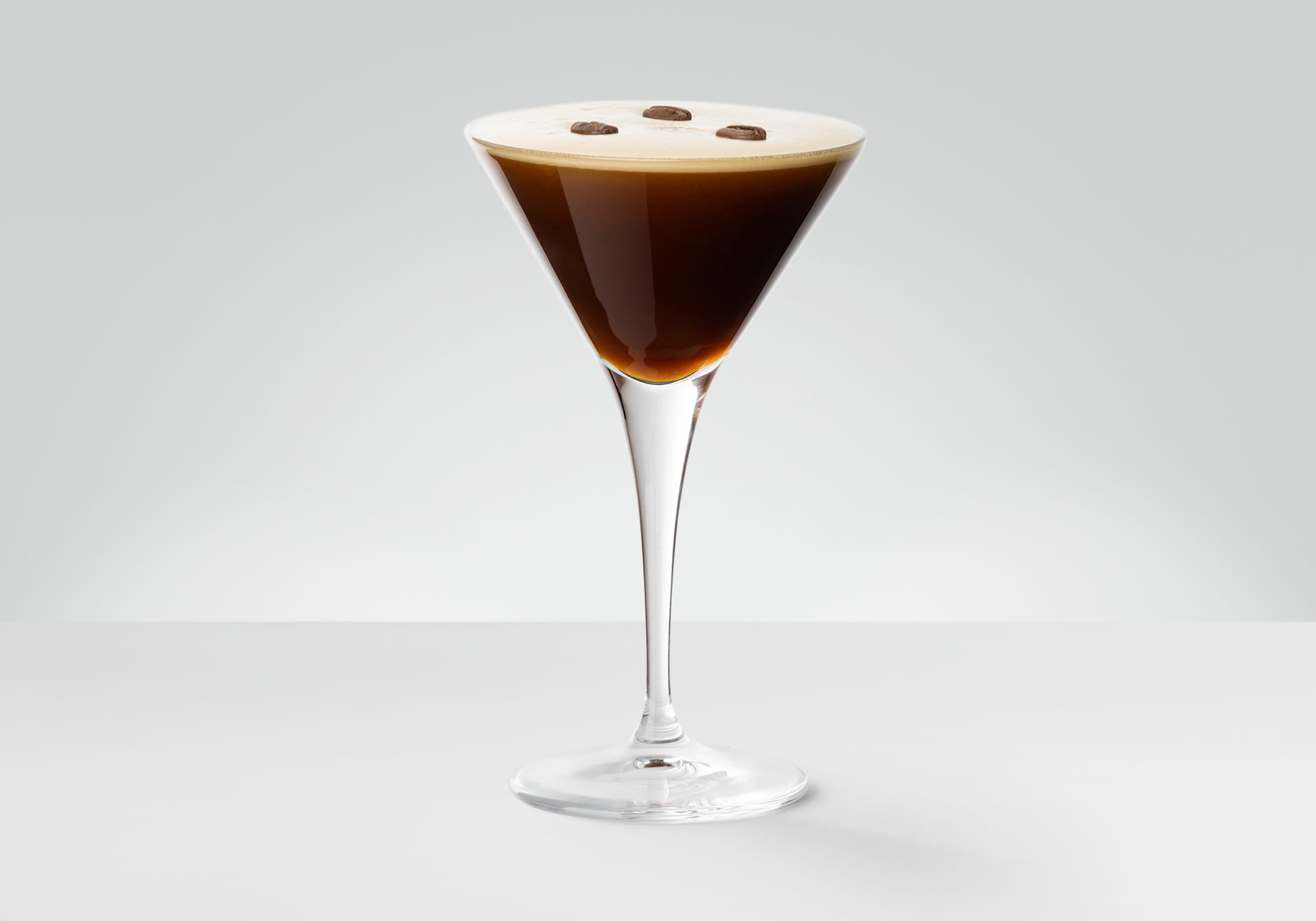Dekorieren Sie den Espresso Martini mit drei Kaffeebohnen.