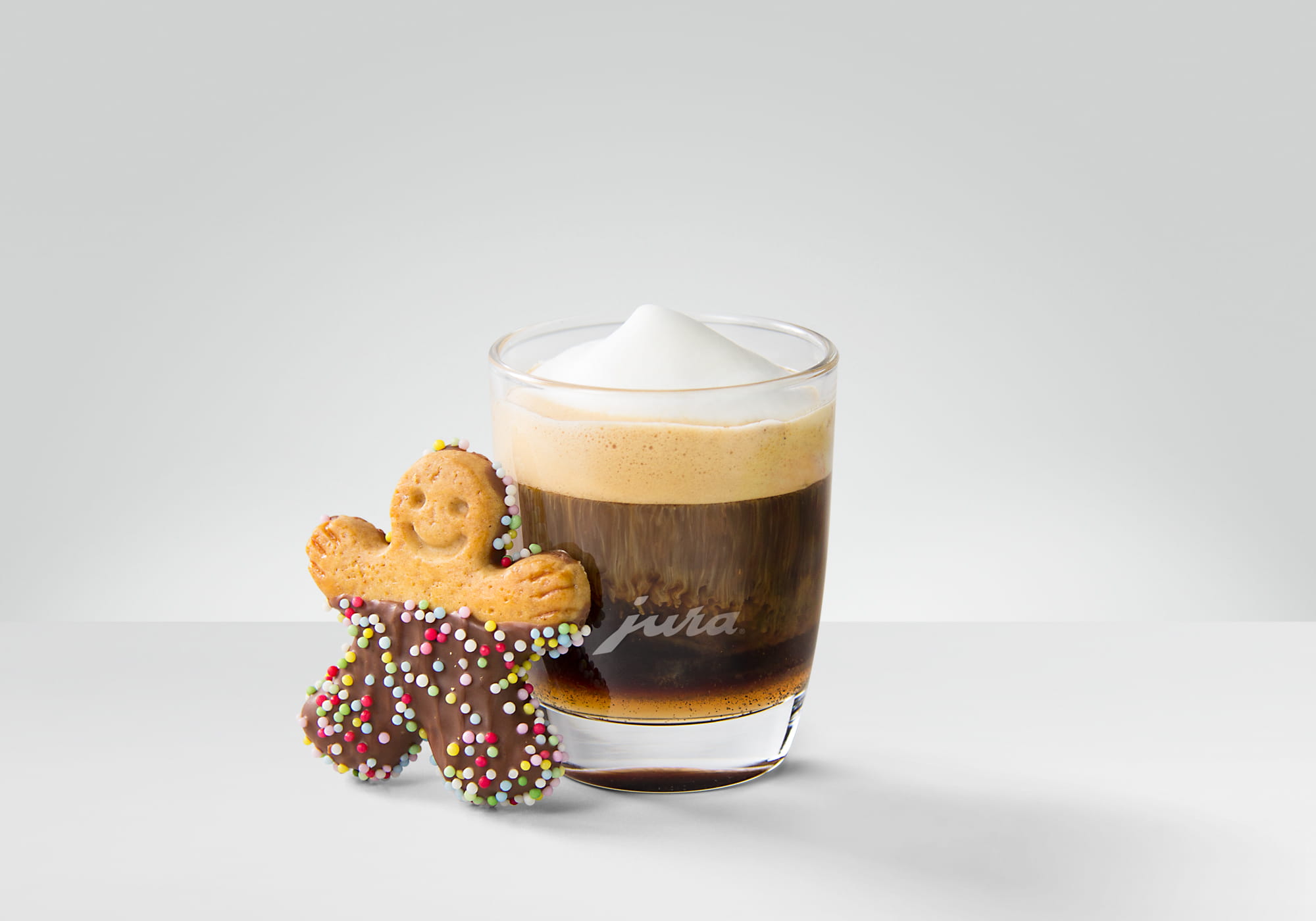 • Geben Sie den Vanillesirup und das Lebkuchengewürz in ein Espressoglas.